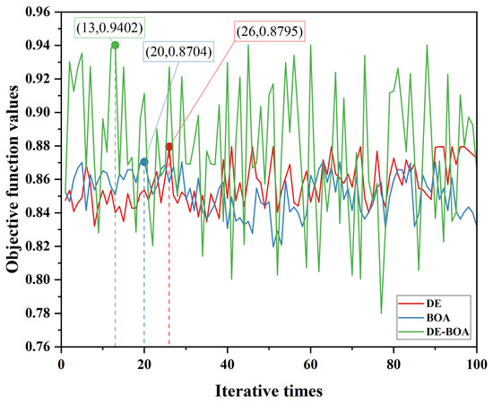 The parameter rate setting speed of the algorithms is also one of the decisive factors affecting the application of intelligent algorithms. In this study, when comparing the speeds of DE, BOA, and DE-BOA algorithms to be the first to find the optimal objective function in 100 iterations (refer to Figure 6), the BOA algorithm achieved the optimal objective function value of 0.8704 in the 20th iteration, the DE algorithm achieved the optimal objective function value of 0.8795 in the 26th iteration, and the DE-BOA algorithm achieved the optimal objective function value of 0.9402 in the 13th iteration. This shows that the DE-BOA algorithm is not only faster but also more accurate in SWMM parameterization.