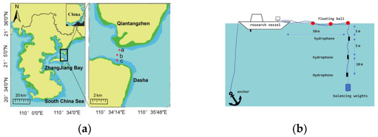 On 12 September 2022, and 21 March 2023, underwater noise data collection was conducted at three stations in Zhanjiang Bay. The locations of these stations are shown in Figure 1a, and detailed information regarding the latitude, longitude, and deployment time of the hydrophones is recorded in Table 1. On the day of the experiment, the weather conditions in the area were cloudy with a southeasterly wind of 3 m/s, and the wave conditions ranged from light to moderate. TS-ZRSTQ-03 self-contained hydrophones and TC4037 hydrophones from the REASON company were used for the experiment, and hydrophones were calibrated using the standard hydrophone comparison method prior to the experiment. The voltage sensitivity of TS-ZRSTQ-03 was −198 dB re:1 V/μPa, with a preamplifier gain of 50 dB. The sensitivity of the TC4037 was approximately −192 dB, with an instrument gain of 40 dB. Both types of hydrophones had a sampling frequency of 100 kHz.