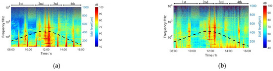Figure 2 and Figure 3 illustrate the variations in underwater environmental noise and tidal changes that occurred on the day of the experiment. The horizontal axis represents time, the left vertical axis represents frequency, and the right vertical axis represents tidal information. The brightness of the images represents the sound pressure level. In the first experiment, collected noise data showed significant variations in the wideband sound pressure level at a range of 50–90 dB throughout the underwater observation period. This high energy was mainly concentrated in a frequency range below 1000 Hz, where the sound pressure level exhibited noticeable fluctuations. As the frequency increased above 1000 Hz, the noise strength gradually decreased and eventually exhibited relatively stable spectral characteristics. The tidal level was initially at a low point at the start of the experiment before reaching its highest point around noon and then beginning to recede.