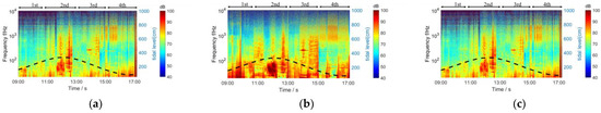 Tidal and noise spectrograms in Spring: (a) 5 m; (b) 10 m; (c) 20 m.