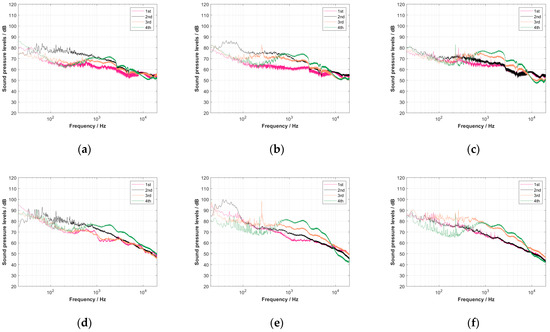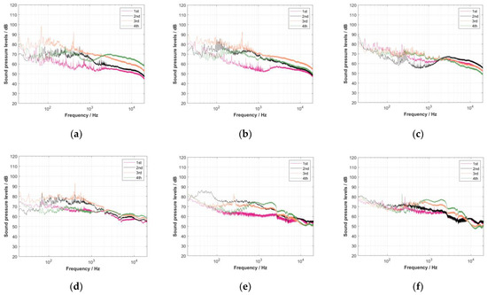Underwater noise spectrograms in autumn: (a) 5 m, station a; (b) 5 m, station b; (c) 5 m, station c; (d) 10 m, station a; (e) 10 m, station b; (f) 10 m, station c.