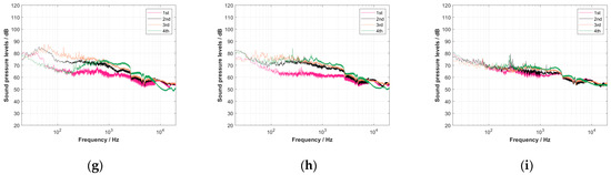 Underwater noise spectrograms in spring: (a) 5 m, station a; (b) 5 m, station b; (c) 5 m, station c; (d) 10 m, station a; (e) 10 m, station b; (f) 10 m, station c; (g) 20 m, station a; (h) 20 m, station b; (i) 20 m, station c.
