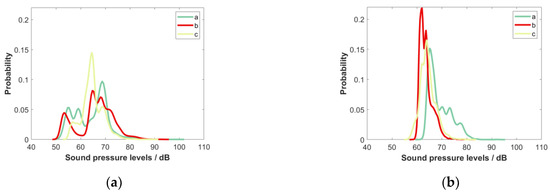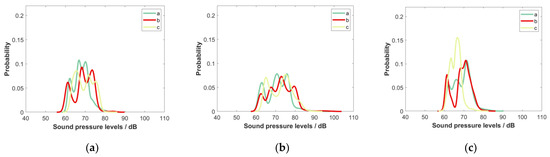 Figure 7 shows the statistical characteristics of noise data measured four times at each station in the spring. Similar to the probability peak distribution characteristics of autumn stations, the probability peak distribution of the same station varied significantly with water depth. Each station showcases three distinct probability peaks. The probability range of the sound pressure level at a depth of 5 m at about 61–79 dB, and the probability peak for the three stations was approximately 70 dB, 73.5 dB, 75.2 dB; the probability peak of sound pressure level at a depth of 10 m was concentrated in the range of 62–81 dB, where the peaks were 75.7 dB, 79.8 dB, 82.4 dB; and the probability peak of the sound pressure level at a depth of 20 m was concentrated in the range of 60–78 dB, where the peak were 71.4 dB, 70.9 dB, 74.5 dB.