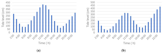 On 12 September 2022, the experimental testing period was from 8:00 a.m. to 4:00 p.m.. The tidal pattern in Zhanjiang Bay on that day was a semi-diurnal tide in autumn. At 8:00 a.m., the tidal level was 132 cm, gradually rising to 310 cm during the rising tide process. Around noon, at 12:00 p.m., the tidal level reached its peak at 420 cm. Subsequently, the tidal level began to gradually decrease and reached 173 cm at 4:00 p.m., as shown in Figure 8a. On 21 March 2023, the experimental testing period was from 9:00 a.m. to 5:00 p.m. The tidal pattern on that day was the same as in autumn. At 9:00 a.m., the tidal level was 214 cm, gradually rising to 279 cm during the rising tide process. Around 12:00 a.m., the tidal level reached its peak at 325 cm. Subsequently, the tidal level began to gradually decrease and dropped below 82 cm at 5:00 p.m., as shown in Figure 8b.