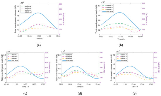 Underwater noise sound pressure level and tidal variation curves: (a) autumn at 5 m; (b) autumn at 10 m; (c) spring at 5 m; (d) spring at 10 m; (e) spring at 20 m.