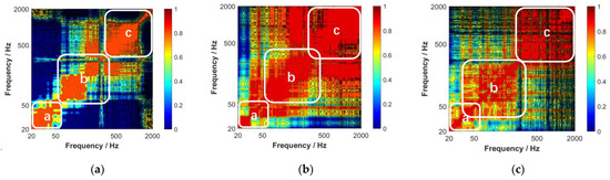 By calculating the correlation coefficient of all frequency pairs, we could understand the contribution of different sound sources to the sound field at various frequencies. The Pearson correlation coefficient for any frequency pair can be calculated using the following Equations (6)–(8):