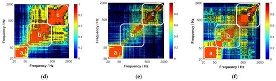 Underwater noise frequency correlation matrix in autumn: (a) 5 m, station a; (b) 5 m, station b; (c) 5 m, station c; (d) 10 m, station a; (e) 10 m, station b; (f) 10 m, station c.