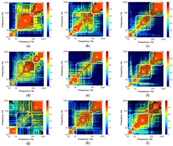 Underwater noise frequency correlation matrix in spring: (a) 5 m, station a; (b) 5 m, station b; (c) 5 m, station c; (d) 10 m, station a; (e) 10 m, station b; (f) 10 m, station c; (g) 20 m, station a; (h) 20 m, station b; (i) 20 m, station c.