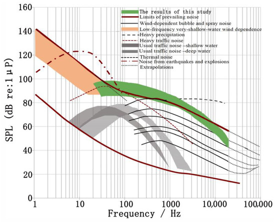 Oceanic environmental noise spectrum distribution chart (modified from reference [2], the green curve represents the results of this study).