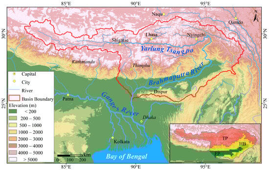 Map of Yarlung Tsangpo-Brahmaputra River Basin (YBRB): TP—Tibetan Plateau, HB—Himalayan Belt, and FP—Floodplain.
