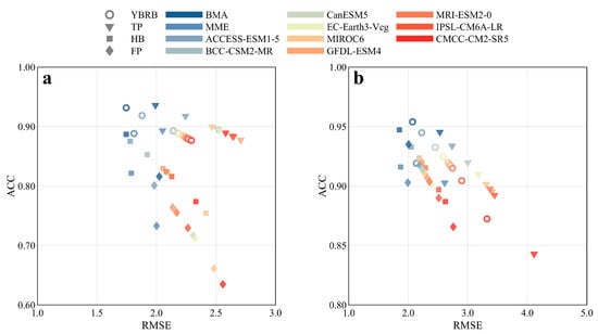 RMSE and ACC between BMA, MME, 9 climate model projections and observations of Tmax (a), Tmin (b) in the YBRB and its accompanying sub-regions during 2005–2014.