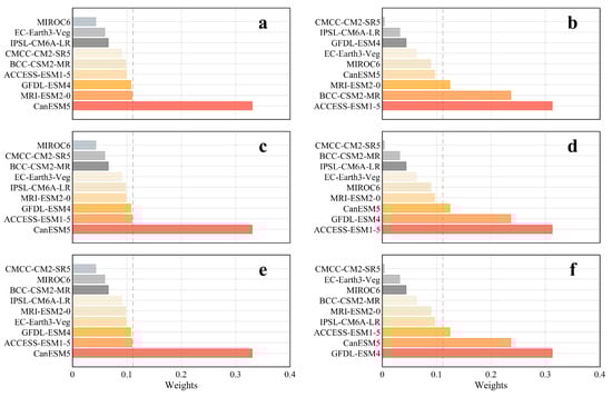 Weight distribution of 9 climate models across different regions (TP: (a,b); HB: (c,d); FP: (e,f)) of the YBRB during the optimal training period (dashed lines depict equal weights): left column (Tmax), right column (Tmin).