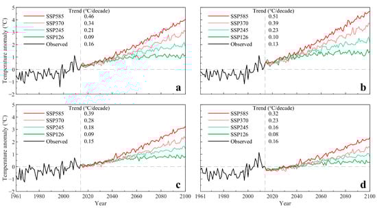Time series of annual surface Tmin from the BMA of 9 CMIP6 models over the YBRB (a) and its three sub-regions (TP: (b); HB: (c); FP: (d)) during 1961–2100 relative to 1961–2014 under SSP126, SSP245, SSP370, and SSP585. Trends were calculated for 1961–2014 observations, as well as SSP126, SSP245, SSP370, and SSP585 during 2015–2100.