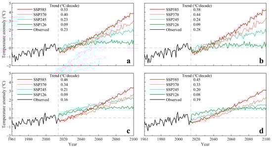 Time series of annual surface Tmax from the BMA of 9 CMIP6 models over the YBRB (a) and its three sub-regions (TP: (b); HB: (c); FP: (d)) during 1961–2100 relative to 1961–2014 under SSP126, SSP245, SSP370, and SSP585. Trends were calculated for 19612014 observations, as well as SSP126, SSP245, SSP370, and SSP585 during 2015–2100.