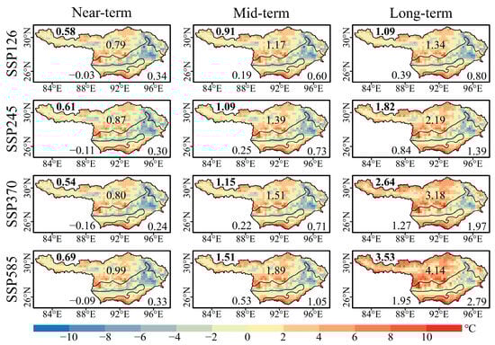 - According to the BMA prediction results, the Tmax and Tmin over the YBRB during 2015–2100 fluctuated upwards under each of the four scenarios, with their respective warming rates increasing with scenario intensity. Under the most ideal sustainable development scenario (SSP126), the increase in the Tmax over the near-, mid-, and long-terms will reach 0.58, 0.91, and 1.09 °C across the YBRB; whereas the increases of the Tmin will reach 0.18, 0.52, and 0.61 °C, respectively. Under the high emissions scenario (SSP585), the increases in the Tmax (Tmin) over the near-, mid-, and long-terms are 0.69 (0.09), 1.51 (1.04), and 3.53 (3.38) °C, respectively. Although the overall future increases in the Tmax and Tmin are predicted to fall below global averages, the spatial differentiation of temperature in the upper and lower reaches of the basin will be more obvious.