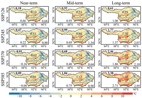 Global climate change is increasingly accepted as fact, as the Sixth Assessment Report of the United Nations Intergovernmental Panel on Climate Change (IPCC) has confirmed that the average global surface temperature in the first two decades of the 21st century (2001–2020) increased by 0.99 °C relative to the global surface temperature during the Industrial Revolution (1850–1900) [1]. Under warmer global temperatures, certain natural disasters (storms, floods, heatwaves, droughts, and fires) are expected to occur more frequently [2,3], significantly impacting agriculture, social economy, human well-being, etc. [4,5,6,7,8], and potentially increasing global conflicts [9,10]. Similar to other parts of the world, significant warming has been observed on and around the Tibetan Plateau in recent decades. Studies have shown that the increased melting of glaciers and snow cover caused by warming in this Third Polar Region will continue to threaten water supply security throughout Asia [11,12]. Daily maximum (Tmax) and minimum temperatures (Tmin) are fundamental metrics in climate change research and important indicators of extreme climate events. Accordingly, reasonable assessments of future Tmax and Tmin values are beneficial for predicting the impact of extreme climate events across all sectors, informing national climate policies, as well as maintaining the stability of regional ecosystems and socioeconomic development.