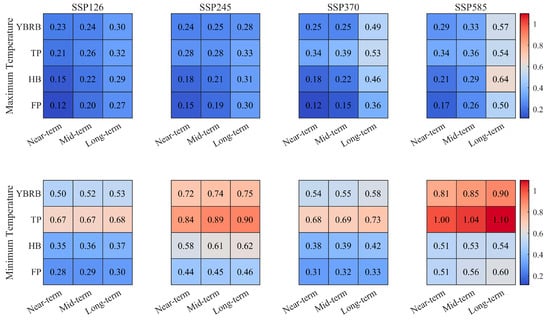 Uncertainty is inevitable during predictions of climate change [59,60], as future impacts on climate (whether man-made or natural) are inherently complex [61]. Accordingly, for projections to be applicable to future climate mitigation and strategic planning, it is necessary to quantify model uncertainty. To this end, model deviation can be used to assess the BMA climate projections [62], where the greater the deviation between the models (i.e., the larger the difference between them in simulating the Tmax and Tmin), the greater the uncertainty and lower the reliability of the predicted results. Figure 8 shows the uncertainty of the BMA-projected YBRB temperature changes over the near-, mid-, and long-term under the four future development scenarios. It was found that the uncertainty of the Tmax was smaller than that of the Tmin. Further, within the same region under the same scenario, the uncertainty of the two temperature variables increased with the forecast time. Across different regions, the TP displayed the largest uncertainty, followed by the HB and the FP. The strong uncertainty associated with the TP region may be related to the complex cryosphere environment. For example, albedo feedback is distorted owing to extensive snow cover over the plateau, potentially leading to large uncertainties in regional future climate projections [33].