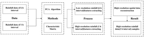 In this paper, short-interval (1 h interval) rainfall data from 2013 to 2022 were used as the study samples to construct the rainfall dynamics characteristic matrix, which was analysed and mined using a PCA algorithm to extract the refined features. The rainfall dynamic feature matrix was constructed, and the PCA algorithm was used to analyse and mine it to extract the refined features of the rainfall spatial data. Based on this feature, the long-interval (6 h interval) rainfall data from 1998 to 2012 were reconstructed to realize the feature enhancement and capacity expansion of the short-interval (1 h interval) rainfall data, which were in line with the characteristics of the rainfall spatial and temporal distribution. Based on this feature, the long-interval (6 h interval) rainfall data from 1998 to 2012 were reconstructed spatially and temporally to realize the feature enhancement and capacity expansion of short-interval (1 h interval) rainfall data that meet the desired rainfall spatial and temporal distribution characteristics. The specific technical flowchart is shown in Figure 1: