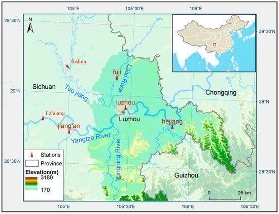 Luzhou is located in the southeastern part of Sichuan Province at the junction of the Sichuan, Chongqing, Guizhou, and Yunnan provinces, as shown in Figure 2. It is a transitional zone between the southern edge of the Sichuan Basin and the Yunnan–Guizhou Plateau. The terrain is low in the north and high in the south, with numerous rivers. The Yangtze River runs from west to east, while the Tuojiang, Yongning, Chishui, and Laixi Rivers are interlaced into a network.
