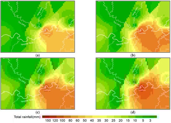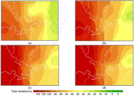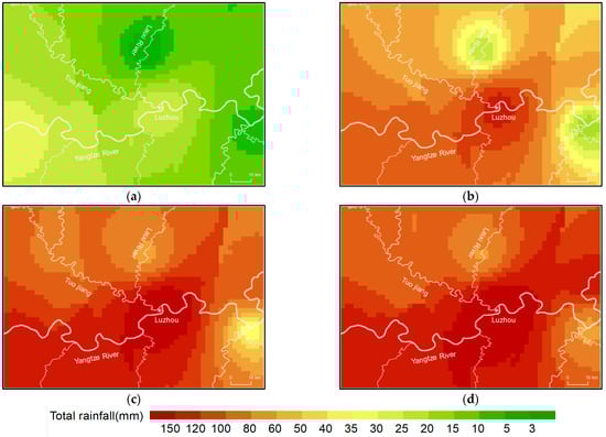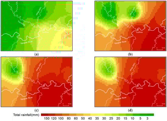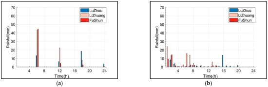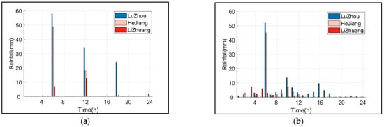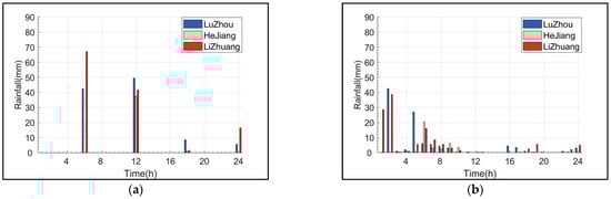 The rainfall on 28 April 2013 was used as an example; this rainfall belonged to the first type of rainfall, in which the centre of the rainstorm moved downstream and upstream. Concentrated rainfall first appeared in Lizhuang, Luzhou and Hejiang, as shown in Figure 13.