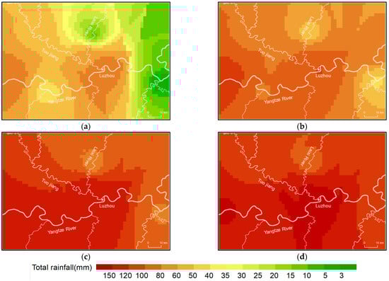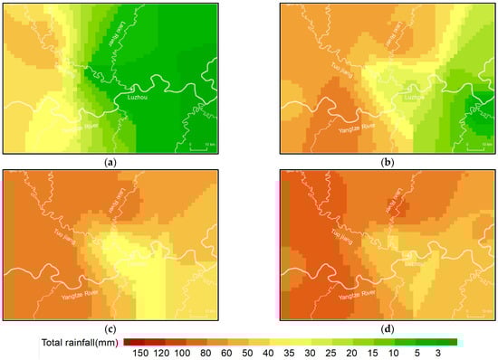 The first rainfall type began downstream of Luzhou City and moved upstream, reaching Luzhou City within 24 h. Due to diffusion from downstream to upstream, this type of rainfall had less impact on Luzhou City, as shown in Figure 4. The spatial and temporal characteristics of the measured rainfall process on 22 June 2003 are of this type. Figure 5 illustrates the rainfall process at 6 h intervals for this event.