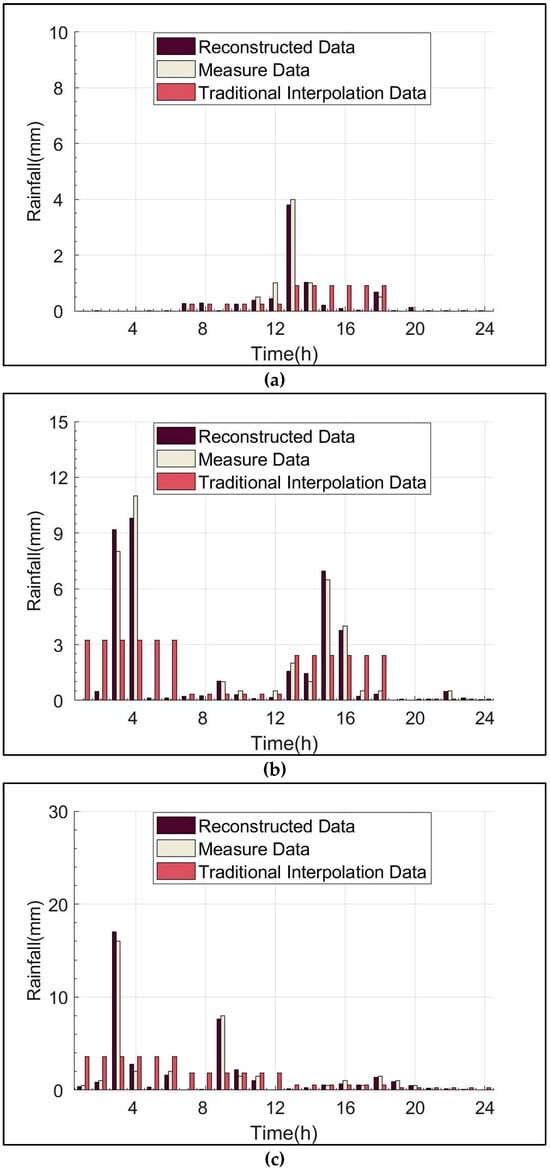 Comparison of reconstructed data, traditional interpolation results and measured data: (a) Lizuhang, (b) Luzhou, and (c) Hejiang.