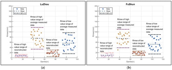 As shown in Figure 14, the average error between the reconstructed data in the high-value area and the measured data had a 95% confidence interval of approximately 15%, and that in the low-value area was 20%. The average error between the average interpolation data in the high-value area and the measured data was approximately 60–100% with a 95% confidence interval, and that in the low-value area was approximately 30–60%. This indicates that the reconstructed data better characterised the concentrated rainfall process and spatiotemporal distribution characteristics of the rainfall. The average interpolation of the rainfall data blurred the central change process of heavy rain in the rainfall process and could not reflect the spatiotemporal distribution characteristics of the rainfall.