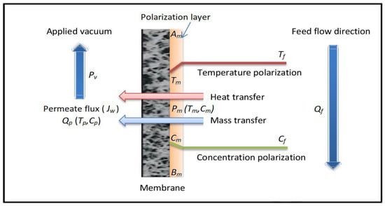 MD systems utilize latent and conductive heat transfer mechanisms to enable the movement of heat. When a boundary layer forms on the membrane’s surface within these systems, the temperature at that specific surface becomes lower when compared to the incoming feed temperature. Conversely, VMD systems experience minimal conductive heat transfer due to the low-pressure environment on the permeate side of the membrane. As a result, the mathematical representation of the heat flux passing through the liquid boundary layer can be expressed by the subsequent equation [53]: