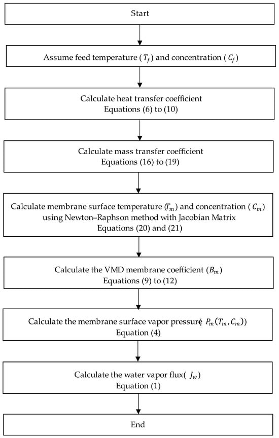 where is the VMD membrane coefficient, is the feed temperature at the membrane surface, is the concentration of solute at the membrane surface, is the feed water vapor pressure on the membrane surface, and is the vacuum pressure.
