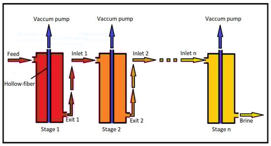 M-VMD has attracted considerable interest for improving the efficiency of single-stage setups. In the M-VMD procedure (shown in Figure 3), the feed solution undergoes initial heating and subsequent introduction into the first phase of the membrane module. A vacuum applied to the opposite side of the membrane aids in liquid evaporation, with the membrane serving as an effective barrier against liquid passage. The resulting vapor is condensed on a cool surface to form a distillate. The remaining brine solution is then fed into the next stage, where the same process is repeated. The vapor produced in each stage is typically recycled and utilized as the heat source for the subsequent stage, thereby improving the overall efficiency of the process.
