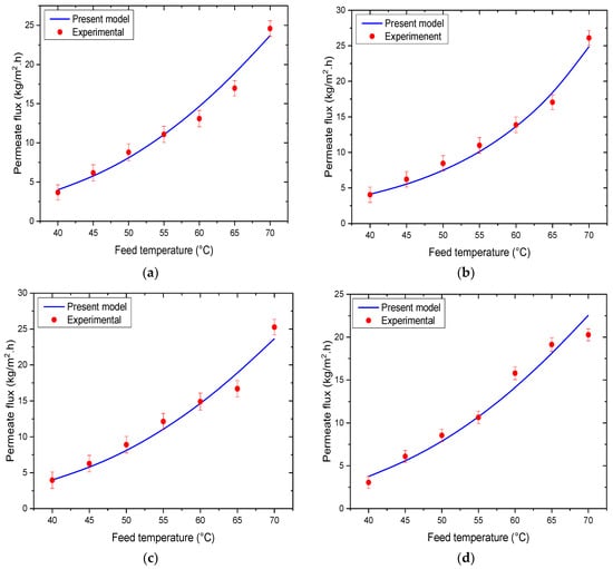 Comparison of experimental and simulated permeate flux for different feed flow rates (a) feed flux 30 kg/m2·h, (b) feed flux 50 kg/m2·h, (c) feed flux 70 kg/m2·h, and (d) feed flux 80 kg/m2·h.