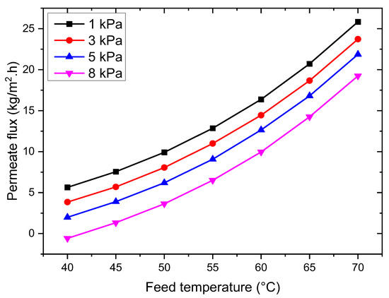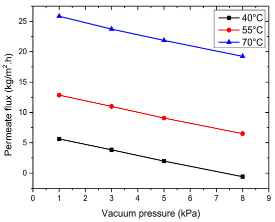 Effect of vacuum pressure on the permeate flux at different feed temperatures.