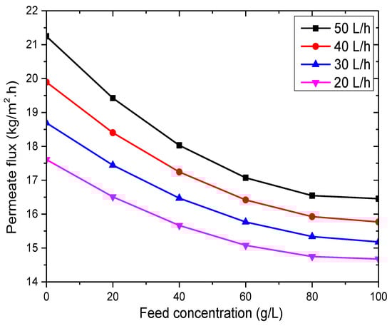 The performance of the VMD process is notably influenced by the concentration of the input solution. As depicted in Figure 8, the flux of the permeate decreases with the increase in the salt concentration at various flow rates. This reduction is attributed to the development of the concentration boundary layer (CBL), which aligns with the thermal boundary layer. As a result, this leads to a decline in resistance to vapor transfer and the flow of the permeate (Equation (15)). The permeation flux experiences a decrease of approximately 12–18% as the salt concentration rises from 0 to 40 g/L due to the decrease in vapor pressure of the solution caused by dissolved chemicals. Furthermore, with the rise in feed concentration from zero to 70 and 100 g/L, the permeation flux experiences reductions of about 18–27% and 20–29%, respectively. This decline can be associated with the decrease in the water activity coefficient, subsequently reducing the driving force across the membrane. Moreover, the physical characteristics of the input solution, including heightened viscosity and density, also influence the mass flow over the membrane by impacting the Reynolds number and heat transfer coefficient.