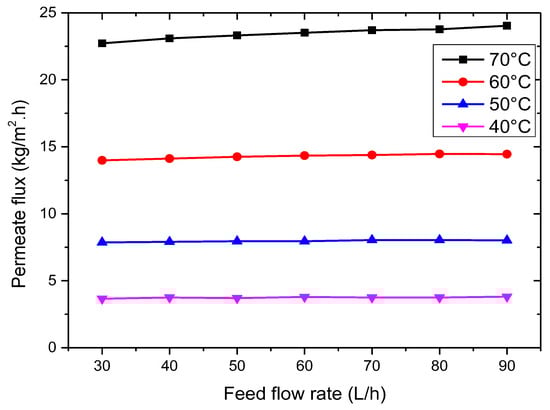 Influence of varying the feed flow rate on the permeate flux under different feed temperatures.