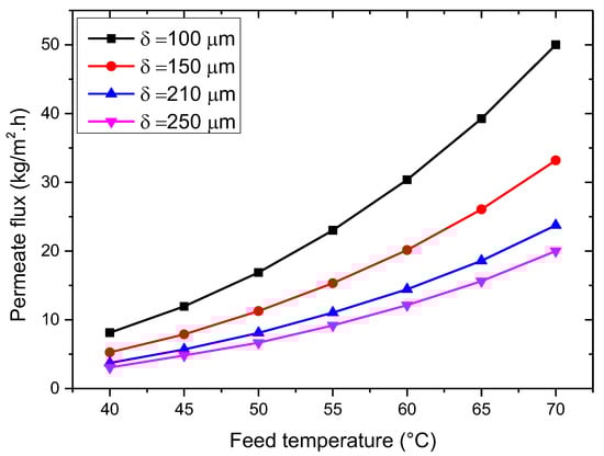 In this research, the precision of the newly devised computational model was validated through a comparison between its outcomes and experimental data obtained from a previous investigation on a VMD system. The VMD system was tested with an aqueous NaCl solution at 3 kPa pressure on the permeate side and a 35 g/L feed solution, considering various flow rates [51]. The agreement between the empirical data and the computational outcomes was strong within the temperature range of 40 to 70 °C, as illustrated in Figure 5.