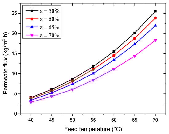 The efficiency of the VMD process is heavily impacted by the rate at which the feed is introduced. Figure 9 illustrates the influence of variations in the feed flow rate and temperature on the permeate flux, while maintaining a constant feed solution concentration at 35 g/L and applying a consistent vacuum pressure of 3 kPa on the permeate side. The findings reveal that the permeate flux undergoes a proportional augmentation with an escalation in the feed flow rate. It is important to note, however, that alterations in the feed temperature do not substantially sway this pattern, as indicated in Equation (13). Elevating the feed flow rate induces a decrease in the thickness of the boundary layer on the feed side, ultimately resulting in an enhanced mass transfer coefficient and permeate flux across the membrane surface. Furthermore, a thinner boundary layer on the heated feed side amplifies the heat transfer coefficient by mitigating the temperature disparity between the bulk feed and the membrane interface. For instance, when the feed flow rate is increased from 30 to 40 L/h, there is an approximate 1% rise in the permeate flux, while elevating the feed flow rate to 60 and 90 L/h leads to increases of about 2.5% and 3.3% in the permeate flux, respectively. These improvements can be attributed to the more efficient mass transfer and heat transfer coefficients at higher feed flow rates, ultimately resulting in a higher permeate flux. However, it is essential to optimize the feed flow rate to ensure efficient MD while preventing fouling or other operational issues. A balanced feed flow rate is critical for achieving the optimal VMD performance.
