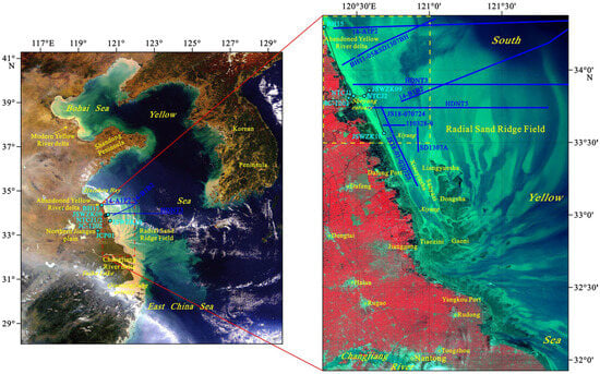 Since the late Quaternary, the evolution of the landforms and sedimentary environments of China’s coasts and continental shelves has been controlled by complex land–sea interactions under the glacial-eustatic cycles [3]. Meanwhile, the interactions between rivers and coastal-continental shelves are extensive and strong, especially for large rivers such as the Yellow River and Changjiang River. The products, processes, and mechanisms of interactions between large rivers and coastal-continental shelves should be an important part of the study of the land–sea interactions in China [4]. The sedimentary systems formed by the interactions of large rivers with coasts and continental shelves contain a wealth of information on global changes; therefore, they are important research carriers for reconstructing sea-level changes and the evolutions of coastal landforms in the estuaries of large rivers, and estimating the fluxes and fates of sediments from large rivers into the sea [4]. Both the Yellow River and Changjiang River have flowed into the South Yellow Sea through the central Jiangsu coast since the late Quaternary, and the river–sea interactions have resulted in a series of deposits, including the Radial Sand Ridge Field (RSRF) off the middle Jiangsu coast formed after the Holocene transgression [4] (Figure 1). Therefore, the central Jiangsu coast and RSRF are ideal areas for studying the sedimentary sequence models of coasts and continental shelves under the interactions of different large rivers in the late Quaternary. Furthermore, they are also important carriers for studying the late Quaternary sea-level changes in the Yellow Sea, the coastal geomorphic evolutions of the paleo-Changjiang and paleo-Yellow River estuaries, and the fluxes and fates of sediments from these two paleo-rivers into the sea.