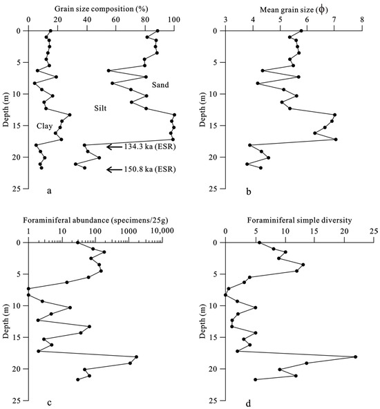 Vertical distributions of several parameters of grain size and foraminifera from core NTCJ1 sediments (modified after reference [13]); (a) vertical distribution of grain size composition of core NTCJ1; (b) vertical distribution of average grain diameter of core NTCJ1; (c) vertical distribution of foraminifera abundance of core NTCJ1; (d) vertical distribution of foraminifera simple diversity of core NTCJ1; two ESR dates from the lower part of core NTCJ1 were plotted in Figure 2a.