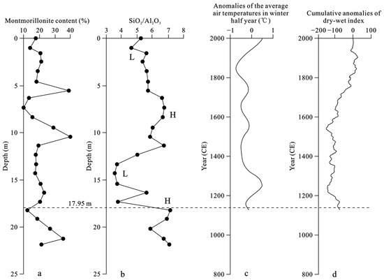 Vertical distribution of montmorillonite content and SiO2/Al2O3 ratios of core NTCJ1 sediments and correlation between these indicators and historical climate changes; (a) vertical distribution of montmorillonite content of core NTCJ1 (modified after reference [13]); (b) vertical distribution of SiO2/Al2O3 ratios of core NTCJ1 (modified after reference [13]); (c) anomalies of the average air temperatures in winter half year for East and Central Regions of China since the Southern Song Dynasty (modified after reference [26]); (d) cumulative anomalies of dry-wet index for Jianghuai Region of East China since the Southern Song Dynasty (modified after reference [26]); the capital letters H show the high ratios and the capital letters L show the low ratios.