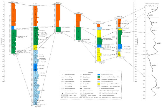 Correlation of the late Quaternary sedimentary sequences of mainly studied cores in the Sheyang estuary and its adjacent area; core BH15 was modified after reference [29]; core JC-1202 was modified after reference [17]; core NTCJ1 and NTCJ2 were modified after reference [13]; core JSWZK09 and JSWZK10 were modified after reference [18]; curve of global sea-level changes was modified after reference [30].
