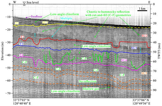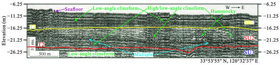 By means of combining the foregoing re-analysis results of the lithology, grain size, ostracods, foraminifera, clay minerals, and SiO2/Al2O3 ratios of core NTCJ1, and then correlating them with the study results of the same sedimentary layer in the adjacent cores BH15, JC-1202, NTCJ2, JSWZK09, and JSWZK10 (i.e., the burial depth of 0.00–18.16 m in core BH15, 0.00–16.26 m in core JC-1202, 0.00–10.4 m in core NTCJ2, 0.00–2.35 m in core JSWZK09, and 0.00–6.75 m in core JSWZK10) [13,17,18,29] (Figure 4, see Figure 1 for the locations of cores), and with the seismic unit SU1 (low-angle clinoform) in the shallow seismic profiles to the north and south of the Sheyang estuary (Figure 5 and Figure 6, see Figure 1 for the locations of track lines), we can judge that the section with the burial depth of 0.00–17.95 m of core NTCJ1 is essentially the abandoned Yellow River deltaic deposits mainly formed in 1128–1855 CE, and may contain a small amount of Holocene coastal-shallow marine deposits at the bottom; however, it is difficult to identify them currently.
