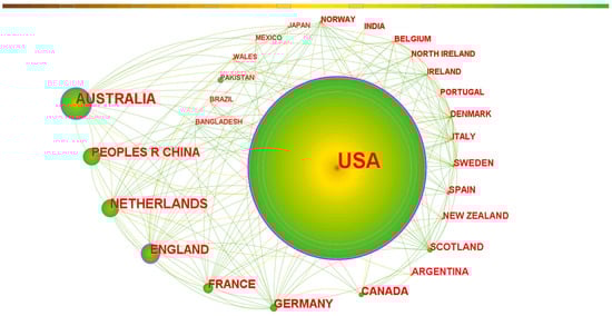 The nodes with purple outer rings in Figure 2 exhibit high betweenness centrality. Betweenness centrality is an indicator that reflects the size of the bridge role of a node in the network. When its centrality is greater than 0.1, it plays an important role in this field. From the perspective of the centrality in Table 1, the USA exhibits the strongest centrality (0.52), followed by England (0.26) and Australia (0.23).