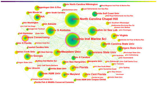 Network maps can help to identify influential institutions and establish connections among potential collaborators [,]. The institutions and cooperative relationships between them are shown in Figure 3. The nodes in Figure 3 represent individual research institutions. The larger the node, the greater the number of articles published by that institution, indicating a stronger academic influence on oyster reef research. The links between nodes reflect the cooperative relationships between research institutions. The more connections there are, the stronger the partnership between institutions.