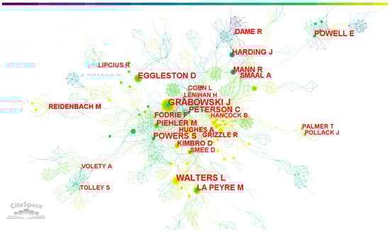 Author analysis reveals the scientific publications contributed by individual researchers to this subject [], as represented by nodes in Figure 4. In this figure, links indicate collaborations between authors.