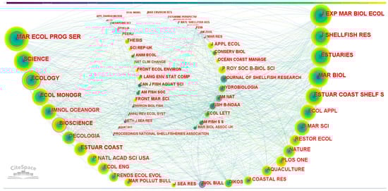 Variables regarding the number of citations linked to publications from each journal are shown in Figure 6 and Table 4. Regarding the citation count analysis, the journals “Marine Ecology Progress Series”, “Journal of Experimental Marine Biology and Ecology”, and “Journal of Shellfish Research” had frequencies of 788, 597, and 574, respectively. The next most-cited journals in oyster reef research were “Science”, “Estuaries”, “Ecology”, “Estuarine Coastal and Shelf Science”, “Marine Biology”, “Bioscience”, and “Estuarine Coastal”. The journals with the highest centrality were “BioScience” (centrality = 0.14) and “Ecology” (centrality = 0.11). A cross-comparison with the co-cited literature analysis below revealed that the relative importance of BioScience was partially because two highly influential articles were published in this journal: “Oyster reefs at risk and recommendations for conservation, restoration, and management” [] and “Economic valuation of ecosystem services provided by oyster reefs” [].
