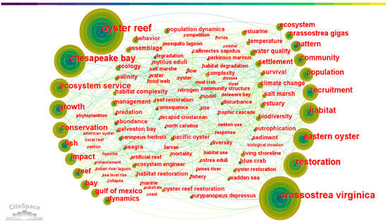 Crassostrea virginica, the most common keyword, is a reef-building oyster species that has formed extensive intertidal oyster reefs in most estuaries and bays on the east coast of North America, from the mid-Atlantic states of the USA to the Gulf of Mexico and the Caribbean [,,]. The next most common keyword was “Chesapeake Bay”, which is a bay located in the middle of the east coast of the USA and is the largest bay in the USA. Historically, this bay has large populations of various oyster species, with C. virginica being most iconic.
