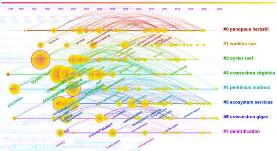 Figure 8 depicts the evolution of oyster reef studies in the temporal dimension, showing the changes in keywords throughout the timeline. The larger the node, the higher the frequency is. Nodes marked by purple circles have greater centrality (≥0.1). A link indicates that the keyword is related. The right side of the figure summarizes several important research clusters, named the Wadden Sea, Crassostrea virginica, ecosystem services and Crassostrea gigas, etc.