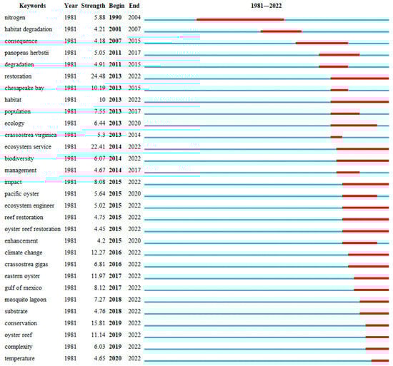 The first identified keyword was “nitrogen”, which appeared in 1990 (Figure 9). Because in coastal ecosystems, nitrogen has been found to be the predominant limiting factor for primary producers. Nitrogen plays an important role in determining ecosystem function. Piehler et al. [] found significantly higher rates of denitrification in structured habitats such as oyster reefs. Nitrogen removal by these habitats was found to be an important contributor to estuarine ecosystem function. Around 2000, the global consensus began to shift toward oyster reef conservation and research. Subsequently, “habitat degradation” became a hot topic from 2001 to 2007. In addition, “degradation” exhibited continued use with strong citation bursts from 2011 to 2015. During 2013–2022, a large number of research hotspots in the field of oyster reefs emerged and related studies increased in abundance. Since 2013, oyster reef “restoration” has attracted much attention and become a prominent research topic. This remains true to this day, with “restoration” being the keyword with the largest citation bursts and most abundant research achievements. Furthermore, in addition to Chesapeake Bay and the Gulf of Mexico, Mosquito Lagoon has emerged as a hot research area since 2018. A total of 27 articles were retrieved using “oyster reef*” and “Mosquito Lagoon” as search terms. For example, Locher et al. [] studied the immediate (first-year) effects of restoration on sediment nutrients through a Crassostrea virginica restoration program conducted in Mosquito Lagoon, and Troast et al. [] explored how fish communities responded in the first 12–24 mo following oyster reef restoration in Mosquito Lagoon. The focus species have been the eastern oyster (Crassostrea virginica) and Pacific oyster (Crassostrea gigas). In addition to the USA, in recent years, other countries have gradually conducted more research on oyster reefs, including Australia (mainly involving the Sydney rock oyster, Saccostrea glomerata), China (mainly in Bohai Bay), and some European countries (e.g., England, Germany, Netherlands, France, and Scotland; mainly involving the Wadden Sea). Along with restoration efforts, the attention paid to the ecosystem services provided by oyster reefs has increased since 2014, indeed “ecosystem service” became the keyword with second strongest burst intensity. Since 2016, under the influence of human activities and global climate change, oyster reef research has tended to diversify. In addition to research on oyster reef restoration and ecosystem services, the impact of global climate change on oyster reefs has become an important research hot topic [,,], as has the role of oyster reefs in responding to global climate change [,]. Finally, “substrate” became a hot topic from 2018 to 2022. These keyword bursts illustrate how oyster reef conservation research has shifted through the years.