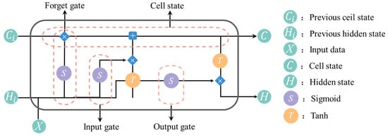 The LSTM model is a variant of the Artificial Neural Network (ANN) model, whose special design structure (cell state and “gate” structure) allows it to avoid the problem of long-term dependency in long-time sequence prediction. Figure 2 reflects a schematic representation of the operation and structure of the LSTM, the details of which can be found in []. The study refers to the basin meteorological flow model proposed by Gauch et al. []. In this research, natural flows were reconstructed using measured data (including precipitation, potential evapotranspiration, temperature, sunshine hours, wind speed, relative humidity, etc.) from meteorological stations in the basin as the input. The NSE, R2, and RMSE were used as evaluation indicators (Equations (4) and (5)).