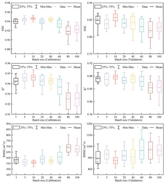 To better train the LSTM model, the model parameters suitable for the watershed in question were determined. This research refers to the study of Yin et al. [], which took the 1961–1969 sequence of the XJR basin as the base period and further divided it into a calibration period (1961–1966) and a validation period (1967–1969). The LSTM model contains many important hyperparameters, including hidden size, epoch, dropout rate, batch size, etc., that usually need to be optimised before the model can be learned. In this study, we first determined the hidden size in the hidden layer, and, through training, we found that the model worked best with 150 neurons. As for the epoch, this study first set a longer epoch (200 times), and, after several training sessions, the best fit was found to be after 150 times, thus setting the epoch to 150 times. And, to prevent overfitting problems during the simulation, a discard layer was set up in the study, with a discard probability of 0.4, which meant that there was a 60% probability that the hidden units in this layer would be retained. In addition, it has been shown that the batch size has an impact on the prediction accuracy of the model. Therefore, we set up eight groups of batch sizes (1 d, 5 d, 10 d, 20 d, 40 d, 60 d, 80 d, and 100 d) to train the XJR meteorological streamflow model 15 times, respectively, and used NSE, R2, and RMSE as the evaluation indicators. The model’s results for the calibration and validation periods are shown in Figure 3, and it can be observed that the simulation works best at a batch size of 10 d.